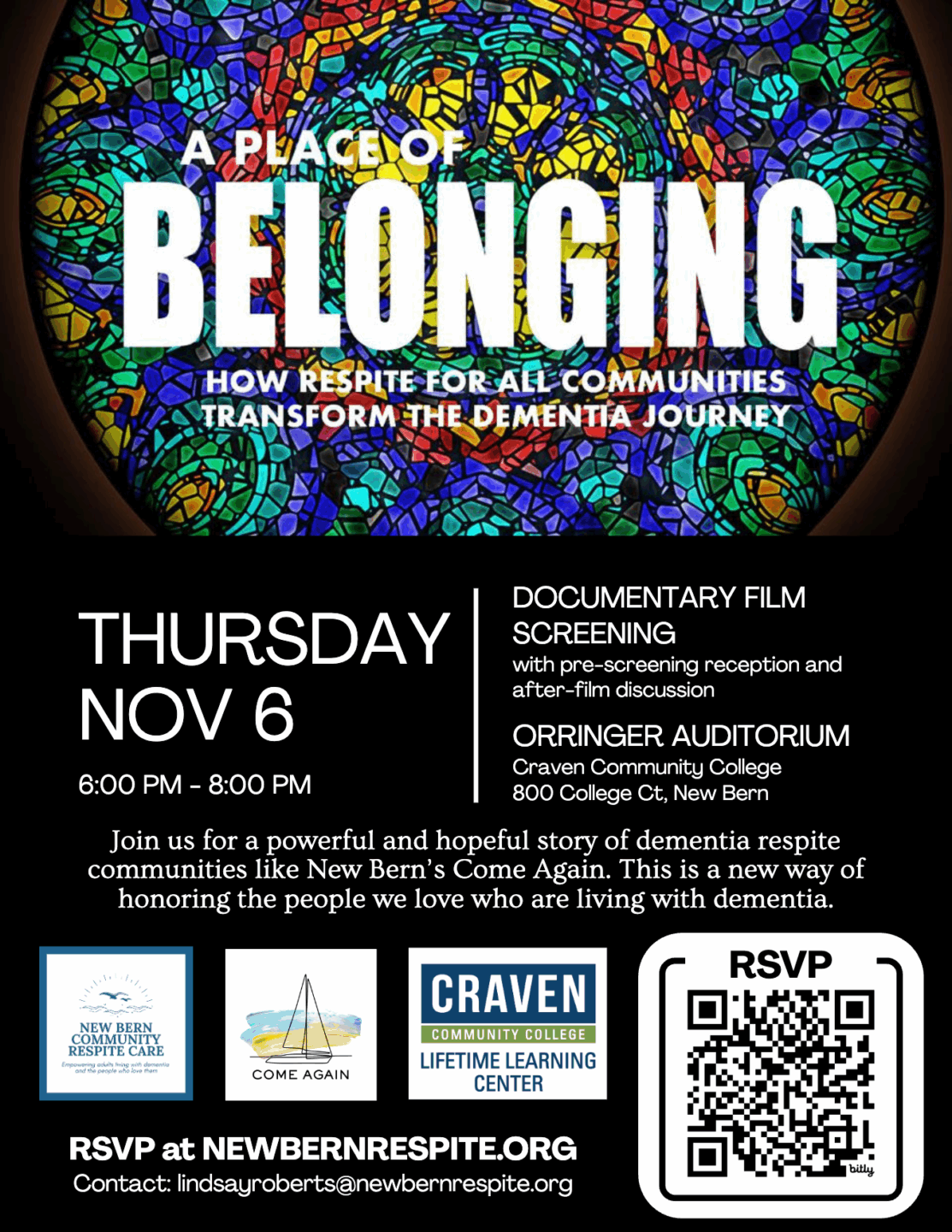 Join us for a documentary about New Bern’s Come Again and other dementia respite communities—discover new ways to honor and care for loved ones living with dementia.